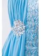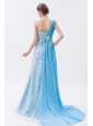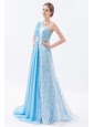 Baby Blue Empire One Shoulder Prom Dress Chiffon and Lace Beading Brush Train