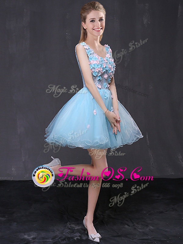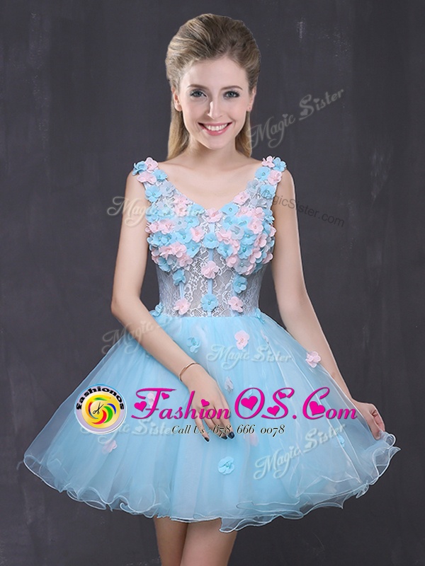 Baby Blue Lace Up V-neck Hand Made Flower Prom Dresses Organza Sleeveless