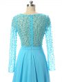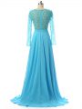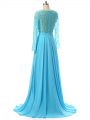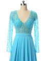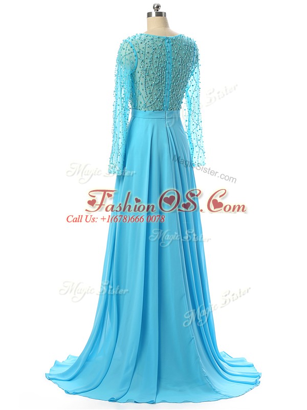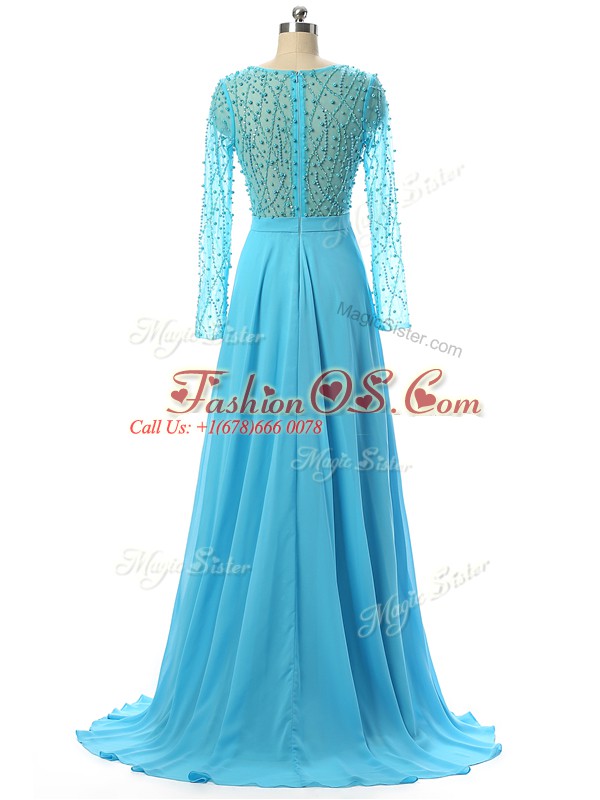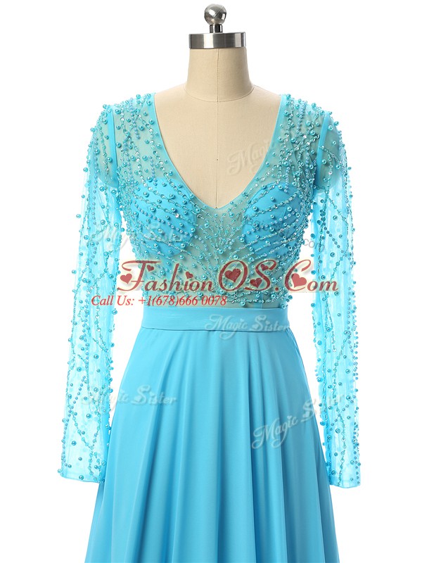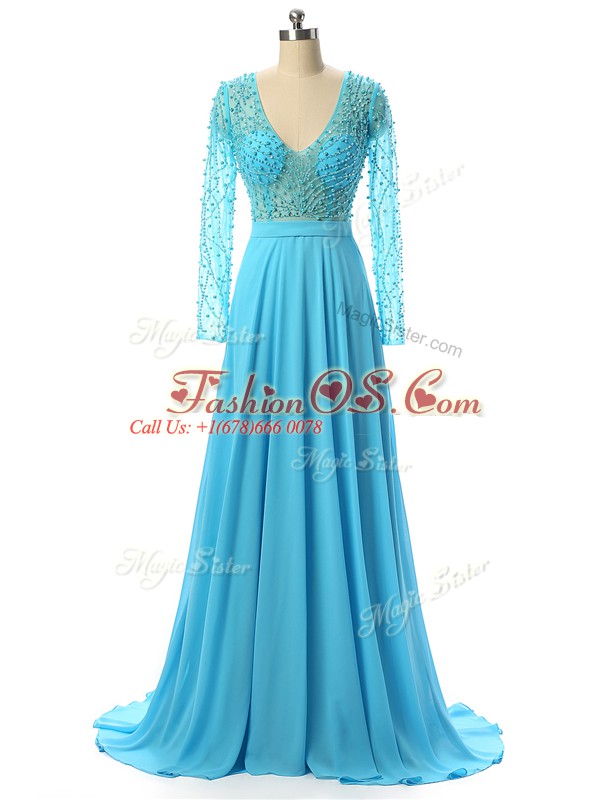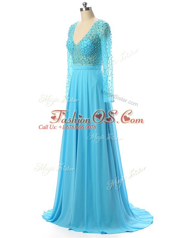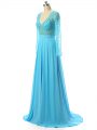 Baby Blue Mother Of The Bride Dress Prom and Sweet 16 with Beading V-neck Long Sleeves Brush Train Zipper