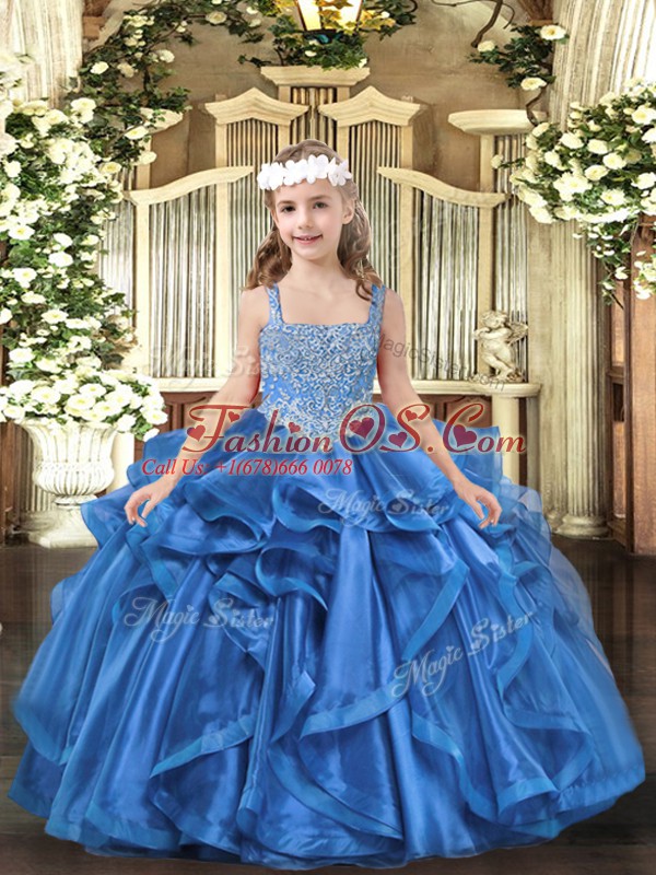 Home >  Special Occasion Dresses >  Pretty Little Girl Pageant Dresses > Baby Blue Organza Lace Up Straps Sleeveless Floor Length Little Girls Pageant Dress Wholesale Beading and Ruffles