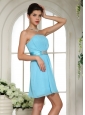 Show off your fun and playful side at your homecoming or prom in this super cute strapless party dress. The strapless neckline, gentle ruched bodice and short chiffon skirt. This blue short dress is charming but sparkling. The shinning beads accents the waist and forms an exquisite satin sash. And a flowing hemline give this fun dress a festive style that says you're ready to party.