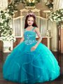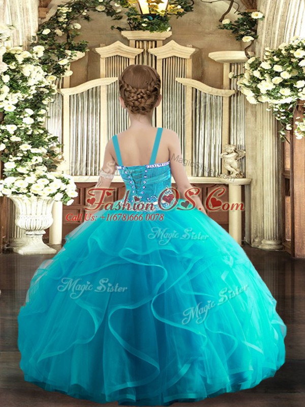 Baby Blue Sleeveless Floor Length Beading and Ruffles Lace Up Little Girls Pageant Gowns