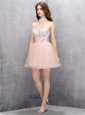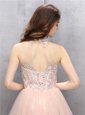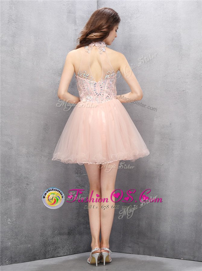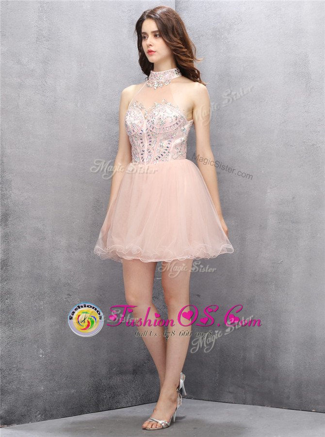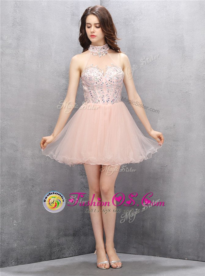 Baby Pink A-line Tulle High-neck Sleeveless Beading and Sequins Mini Length Zipper Prom Dresses