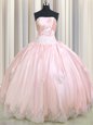 Baby Pink Ball Gowns Strapless Sleeveless Taffeta Floor Length Lace Up Beading and Appliques 15 Quinceanera Dress