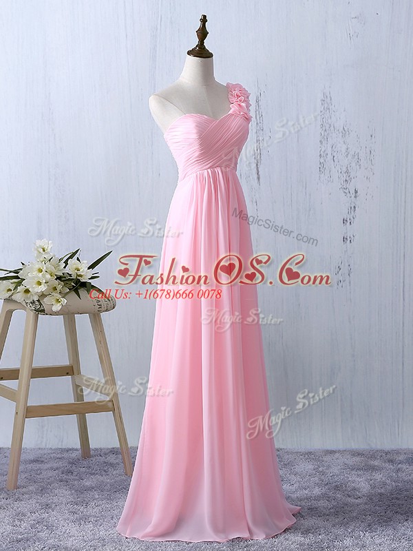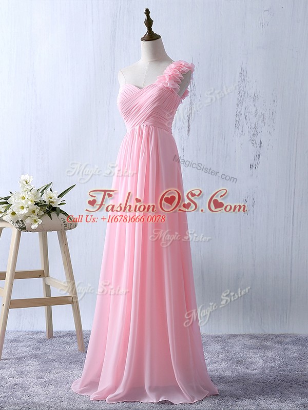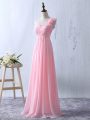 Baby Pink Chiffon Zipper Bridesmaid Dresses Sleeveless Floor Length Ruffles and Ruching