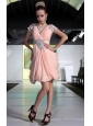 Home >  Prom Dresses >  Short Prom Dresses > Baby Pink Column V-neck Mini-length Chiffon Beading and Rhinestones Prom Dress