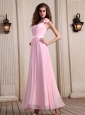 Baby Pink One Shoulder Prom Dress With Hand Made Flower Ankle-length Chiffon For Party