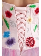 This style is sure to wow! The form-fitted bodice features a lovely sweetheart neckline and a corset design with visible fishbones. Dramatic touches lies on the colorful and authentic flowers all over the bodice will make you the fairy dacing in the shrub when you move, inspiring and charming! The floor length A-line skirt covered with contrasting and multi-tiered organza layer with clean lines and folds draps fully and beautifully. An elegant lace up tie back secures the dress in its place. It's undoubtedly a feast for the eyes.