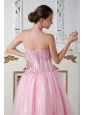 This pink design is a combination of sexy and elegant. The sweetheart neckline style bodice in tulle fabric is well accented with exquisite appliques and embellsihed strings. While the floor length skirt in many layers is pure with no redundant. A lace up closure completes this unique design. You will be the spotlight once you are in this dress.