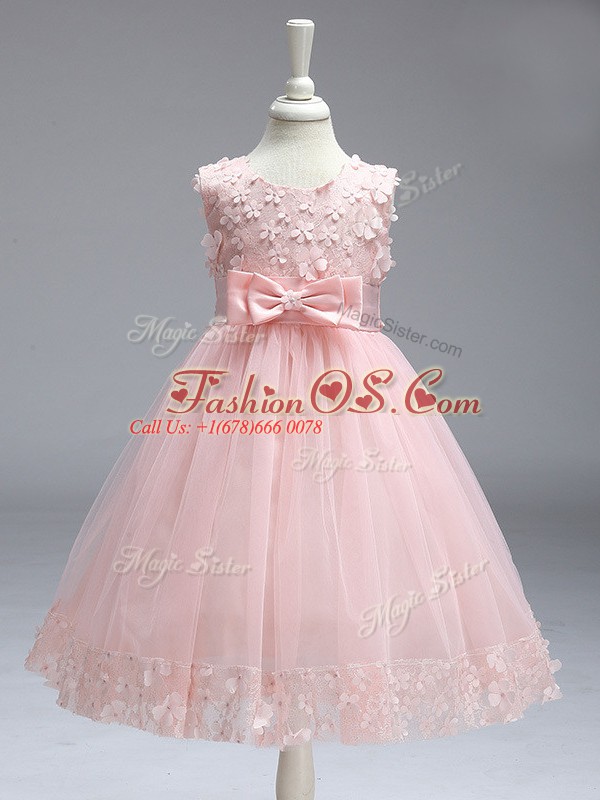 Baby Pink Scoop Neckline Lace and Bowknot Little Girl Pageant Gowns Sleeveless Zipper