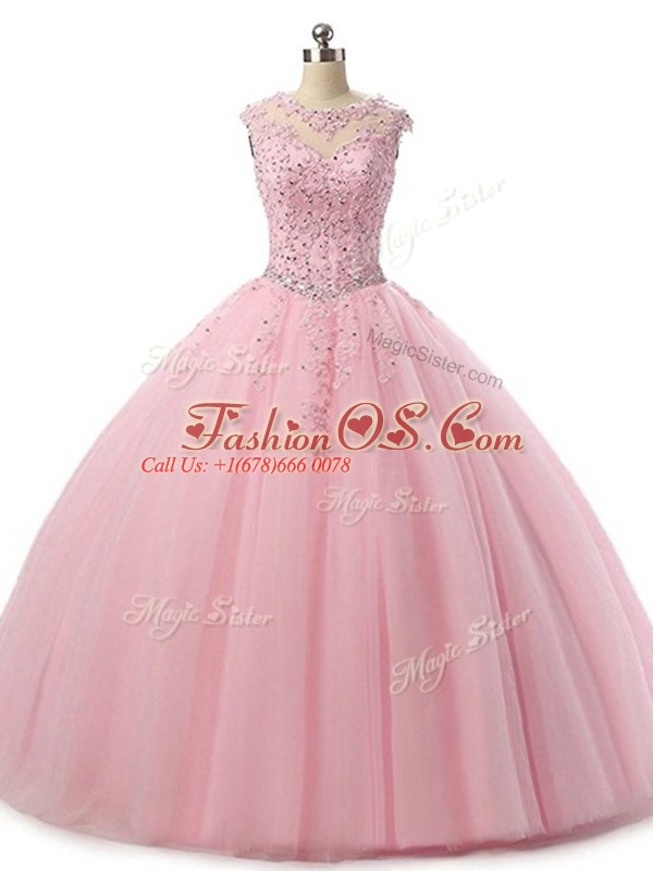 Baby Pink Sleeveless Floor Length Beading and Lace Lace Up Quinceanera Dress