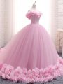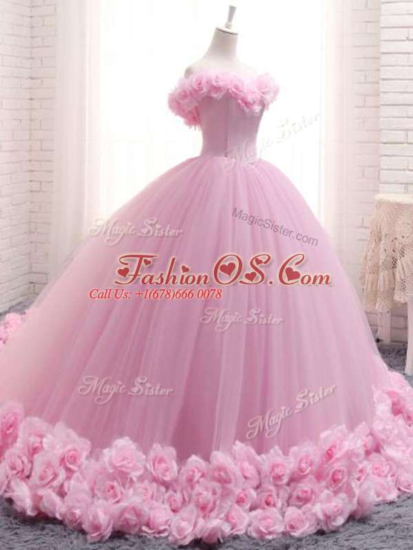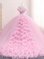 Baby Pink Tulle Lace Up Sweet 16 Quinceanera Dress Sleeveless Brush Train Hand Made Flower