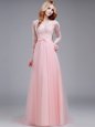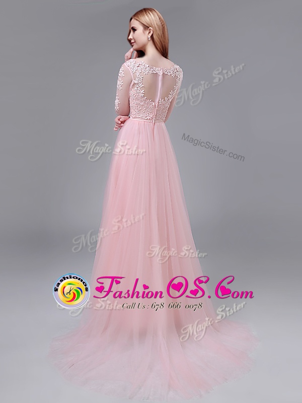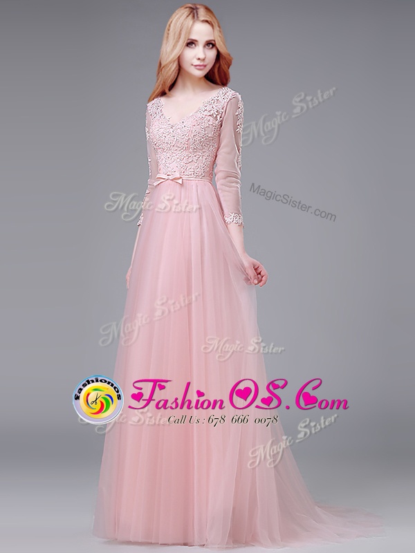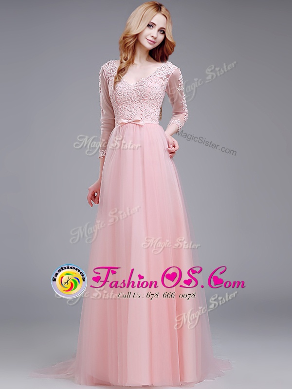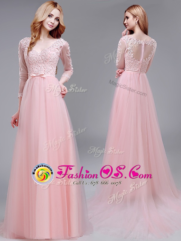 Home >  Prom Dresses >  Perfect Prom Dresses > Baby Pink Tulle Zipper V-neck 3|4 Length Sleeve With Train Prom Evening Gown Brush Train Lace and Bowknot