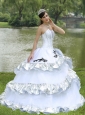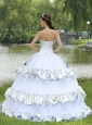 Do you want to dress like a princess? If so, you can not miss the romantic white quinceanera dress. The bodice features an strapless neckline and the boning details which will absoutely accentuate your curve. A V-neck is show off through the sheer fabric covers it do make the dress sexy. The ruffle split on the skirt adds full and beauty to the dress. And the scattered floral embellishments throughout the dress make you like an angel in the mysterious gaden. The simple lace up back makes the dress more adjustable and comfortable.
