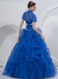 So pretty and gorgeous this royal blue quinceanera dress is! The natural, strapless bodice is accented with some shimmring beadings. The ruching throughout the bust area shows your slim figure completely. The ball gown skirt with some hand made flowers makes this design exquisite and graceful. There is also a matching jacket for you to cover your shoulders, but it's up to you whether you want to order it or not. A lace-up closure completes this fabulous dress. You will be the spotlight in the party.