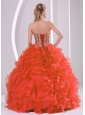 Ball Gown Sweetheart Ruffles and Beaded Decorate Coral Red Sweet 16 Dresses