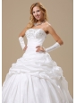 If you are looking for a princess like wedding dress, this one is the one you can't miss. It features a strapless bodice and exquisite appliques with clear beading on the bodice as well as the waist make the dress dazzling. The first taffeta layer of ruffle starts from the waist creates a fashionable look. The lace up back complete the look. This eye-catching dress is a dream of every girl.