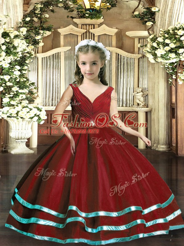Home >  Special Occasion Dresses >  Pretty Little Girl Pageant Dresses > Ball Gowns Pageant Gowns For Girls Wine Red V-neck Organza Sleeveless Floor Length Backless