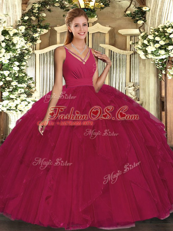 Ball Gowns Quinceanera Dresses Fuchsia V-neck Tulle Sleeveless Floor Length Backless