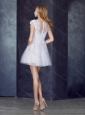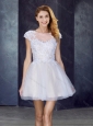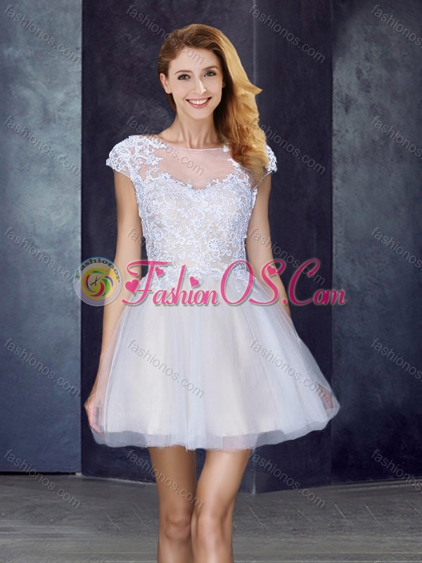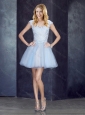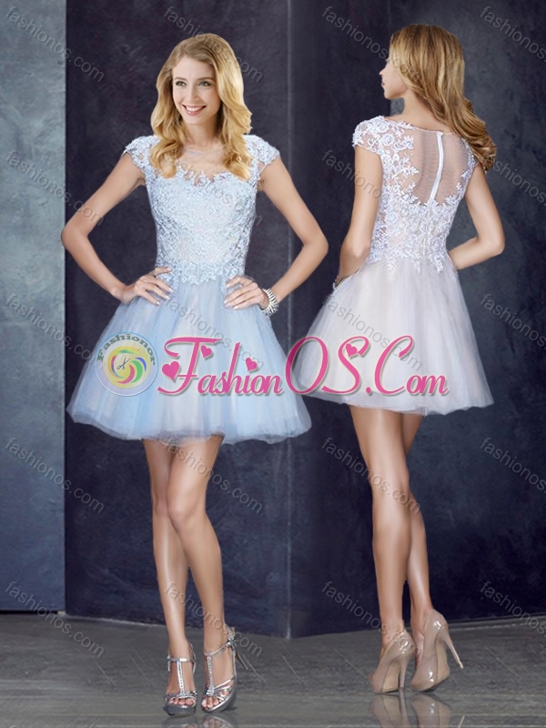 Bateau Applique Light Blue Short Prom Dress with Cap Sleeves