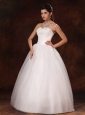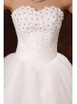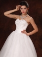 Elaborate on your formal-themed wedding with this stunning bridal style. The corset bodice has a strapless neckline pebbled with dazzling crystalline jewels and nice little flowers which are big attractive points. The a-line skirt made from layers of tulle is pure with no redundant. Lace up back completes this design. To have a dreamful wedding, you are sure to choose this style!