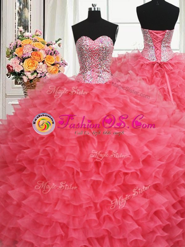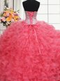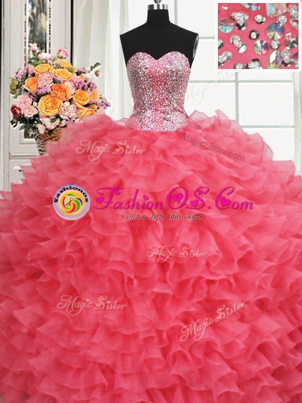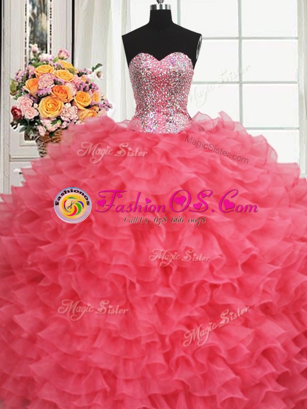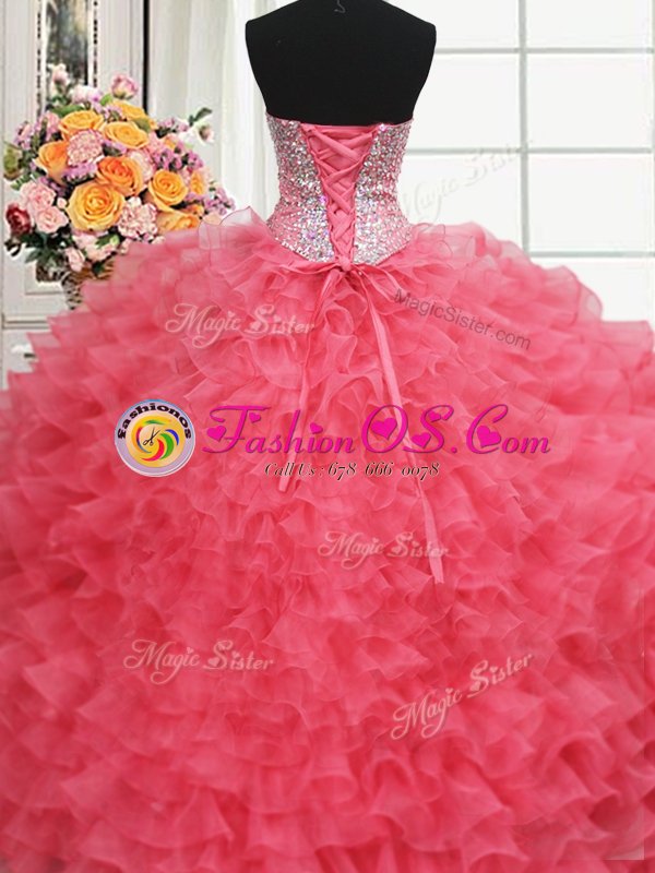 Beaded Bodice Coral Red Sleeveless Floor Length Beading and Ruffles Lace Up Vestidos de Quinceanera
