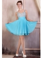 Beaded Decorate Brust Straps Chiffon Knee-length Aqua Blue Prom Dress