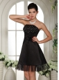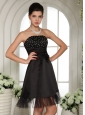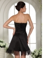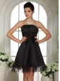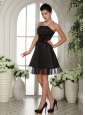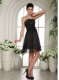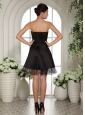Take a walk on the wild side in this fabulous black short dress. The fitted bodice features a strapless neckline with shimmering beads decorate the bust. The midsection is enruseted with a wide waistband adorned with an according flower that adds more interests. A A-line skirt create a nicely fure with sheer tull edge. A chic and sassy short dress for your special occasion.
