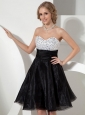 An lovely yet sexy prom dress features a sweetheart neckline and a sheathy bodice encrusted with crystals. The bandage style waistband accents the mid-section. The black orangza with knee length give you a sassy look. A zipper up back completes the perfect design. It seems contradict but actually creates a fabulous look.