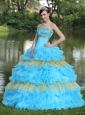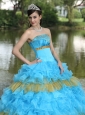 Home >  Quinceanera Dresses >  Fashionable Quinceanera Dresses > Beaded Decorate Bust Sequins Organza Aqua Blue and Yellow Strapless Floor-length Tiered Sweet Quinceanera Dress For 2013