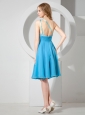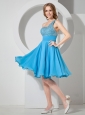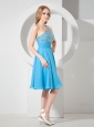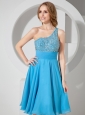 Realize your sweet dream with this stunning short dress! This wonderful blue one shoulder dress is featured with glittering beading accents on the right bust, together with the ruched left bust make the dress dazzlingly shaped. Half open back completes the look. The flowy chiffon continue the already chic dress more romantic. You are surely to be the hotest one in the party!