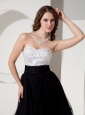 This amazing short prom dress is made by two contrasting colors that add a lot of fun and allure! It features a modest sweetheart and glittering beading for accent. The ruched waistband stand out your slime figure. The black tulle with many tiers that you can move elegant and easily. A hidden zipper makes for easy off and on and secures the dress in place.