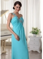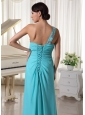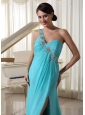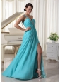 Beaded One Shoulder Turqupise Blue Prom Dress With High Slit Brush Train Chiffon