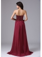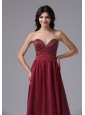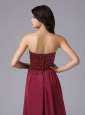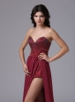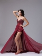 Heads will turn at your arrival if you wear this fabulous dress. This wine red high-low style prom dress features a sweetheart neckline and the whole dress is adorned with fashionable and colorful crystal. An elegant and flowy attached train that cascades to the floor is placed by a waistband. You are sure to be the stunning star of the party.