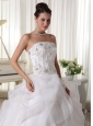 If you are looking for a princess like wedding dress, this one is the one you can't miss. It features a strapless bodice and exquisite appliques with clear beading on the bodice as well as the waist make the dress dazzling. The first organza layer of ruffle starts from the waist which shows a slit in the middle creates a fashionable look. Similar appliques scattered on the skirt and lace hem line complete the look. This eye-catching dress is a dream of every girl.