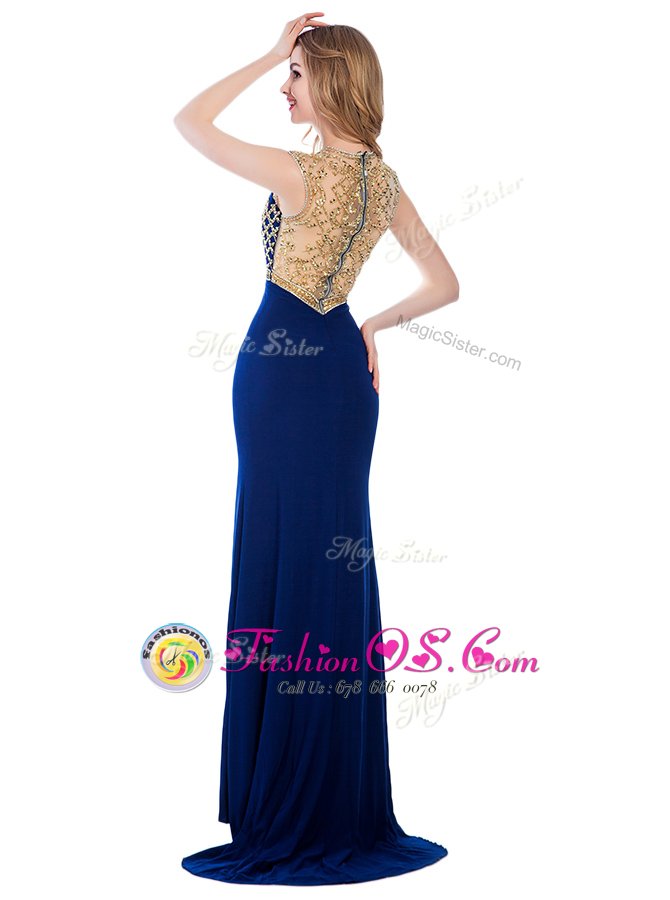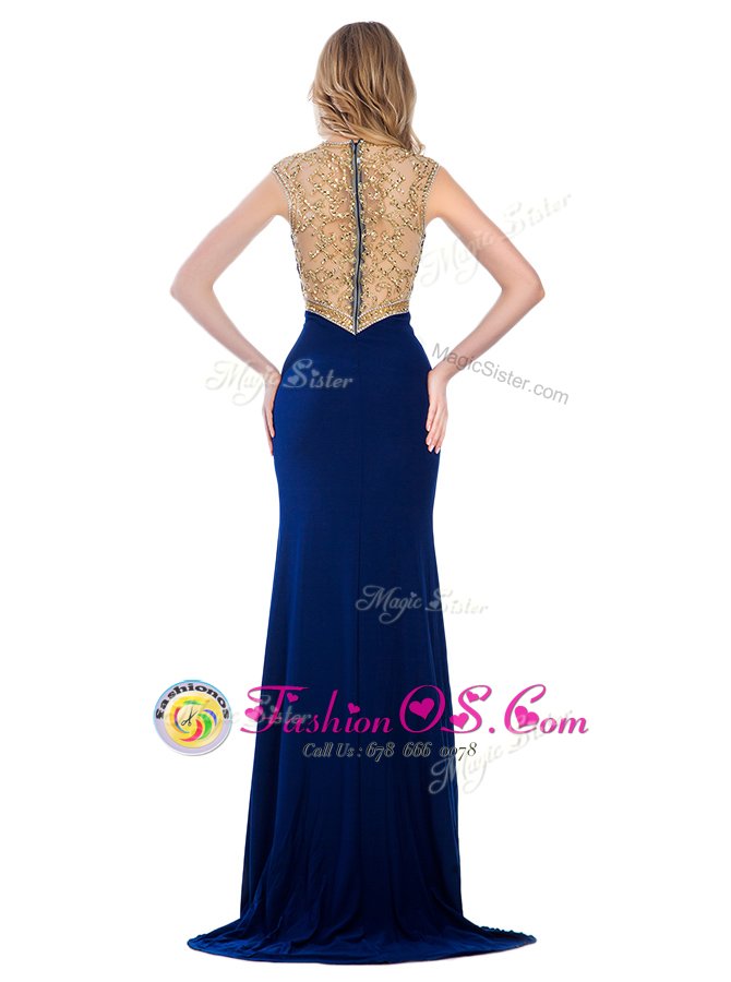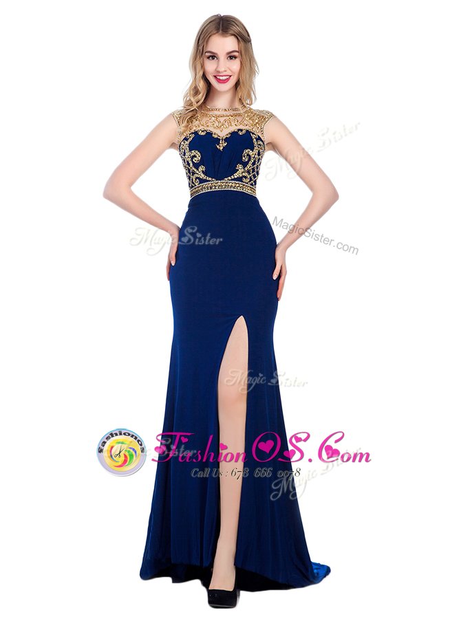 Beading and Appliques Evening Dress Navy Blue Zipper Sleeveless With Train Sweep Train