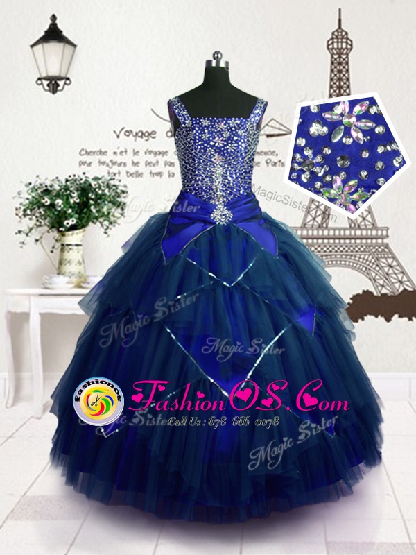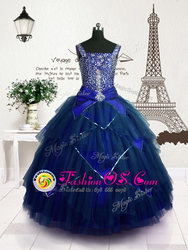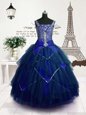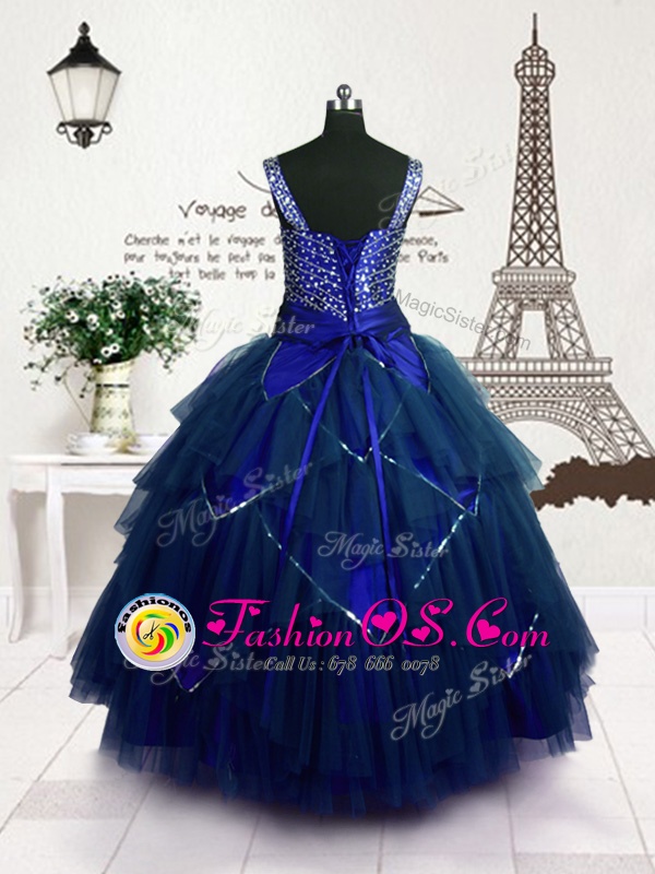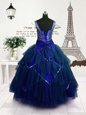 Beading and Belt Kids Pageant Dress Royal Blue Lace Up Sleeveless Floor Length