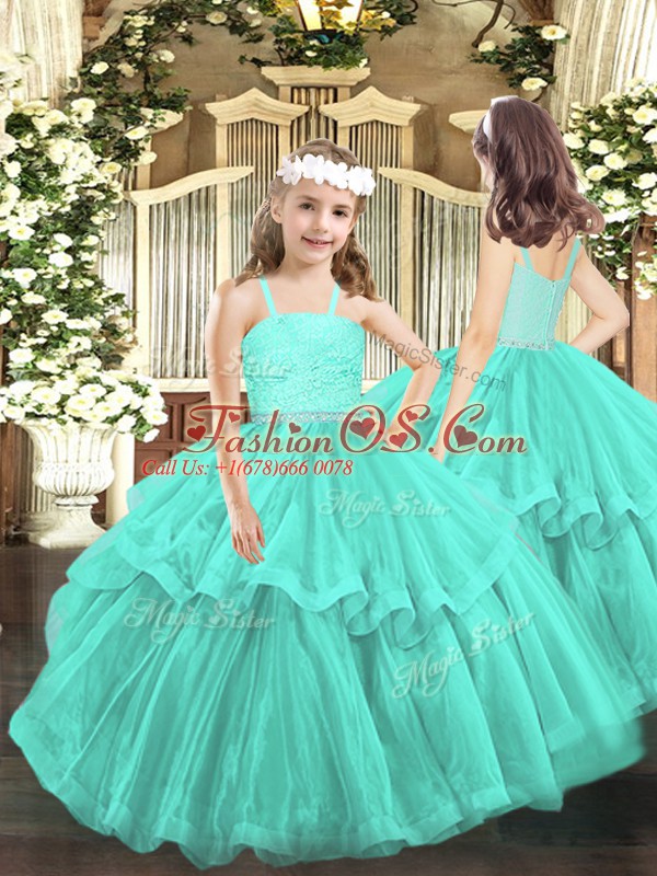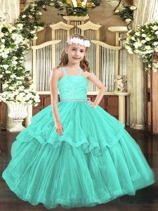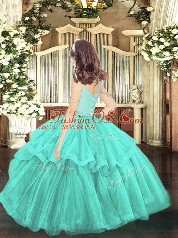 Beading and Lace Little Girls Pageant Dress Turquoise Zipper Sleeveless Floor Length