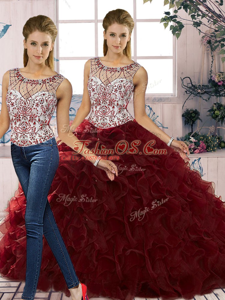 Beading and Ruffles Ball Gown Prom Dress Burgundy Lace Up Sleeveless Floor Length