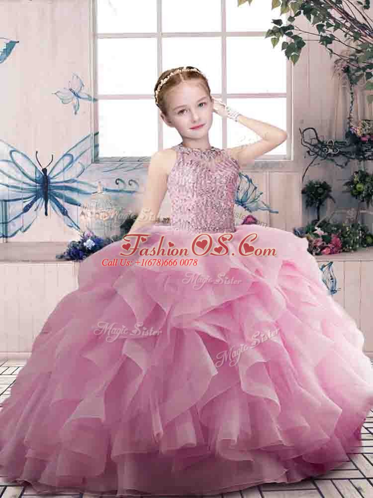 Beading and Ruffles Pageant Gowns For Girls Pink Zipper Sleeveless Floor Length