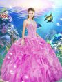 Beading and Ruffles Quinceanera Dress Rose Pink Lace Up Sleeveless Floor Length