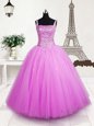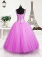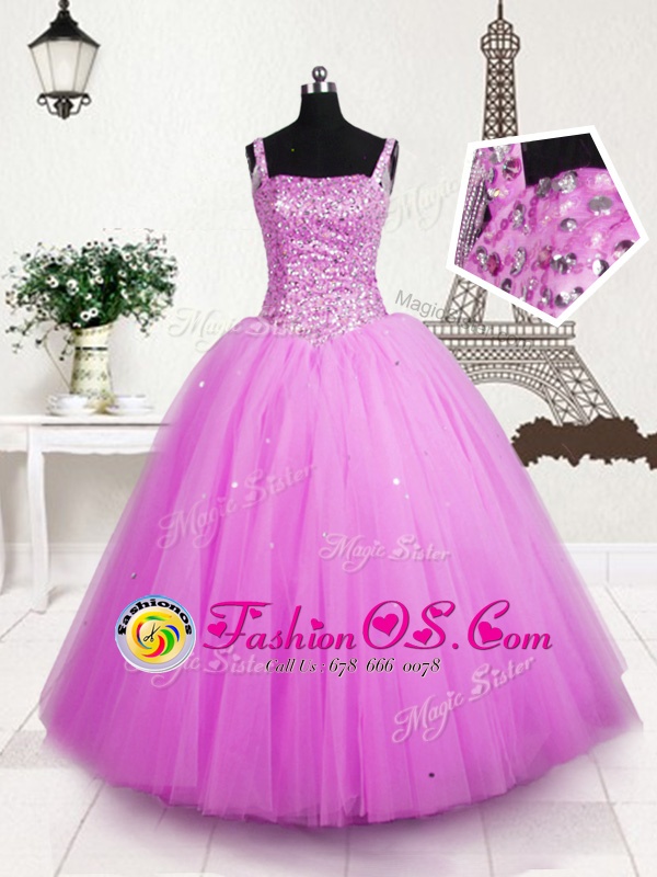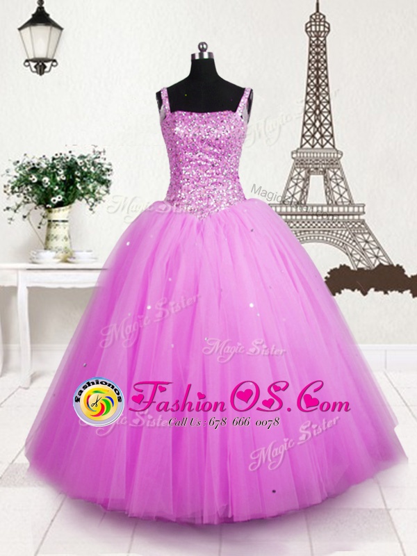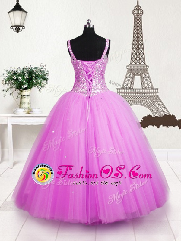 Beading and Sequins Little Girls Pageant Dress Wholesale Rose Pink Lace Up Sleeveless Floor Length