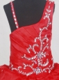 Stunning pageant dress for girls. This grecian style long pageant gown displays a beaded one shoulder and bodice. Completing the look of this girl long pageant dress is  a multi tiered soft tulle ball gown skirt. Make this adorable dress perfect for your 2012 pageant.