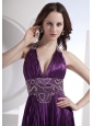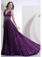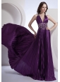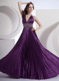 Sexy, shimmery floor length gown features a v-neck bodice with ruched A-line figure. The V-neckline with beaded straps gives the dress an allure yet elegant look. Vertical ruchings adorn the bust while beading decorated waistband defines the mid-section a stunning look. The pleated skirt adds more elegance to create a beautiful brush train. A half-open back with a zipper show off your beauteous back skin and finishes the dress.