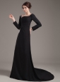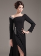 A gorgeous party dress for the woman who wants to sparkle and delight at prom or special occasion party. This black elegant dress features a batteau neckline and two long sleeves. A seductive side slit lets you glide across the dance floor with ease. The chiffon long skirt with a brush finished the wonderful silhouette.