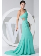 Beading Decorate Bodice One Shoulder Turquoise Chiffon Brush Train Prom Dress For 2013