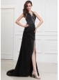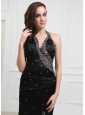 Extremely sexy is what this black dress portrays! This flirty dress accents a halter top and deep V-neckline which make a way for a sexy half-open back and a lot of sparkling beading for accent. The floor length slit skirt flows alluringly with a loose fit that will make it easy to dance the night away. A stunning dress for those occasions when you really want to 'wow' the crowd.