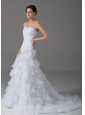 fabulous is the word created for this dress,if you are looking for something total different, this must be the own you shoulder consider,it features a pretty sweetheart neckline on the heavily ruched bodice which contiunes to the hips to create a little mermaid style,layers of organza ruffles complete the skirt which continues in the back to shape a court train,just like floating in the air when you move,a lace up back closes the look