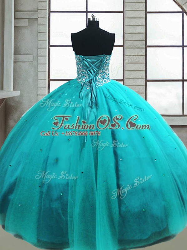 Beading Quince Ball Gowns Aqua Blue Lace Up Sleeveless Floor Length