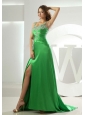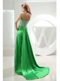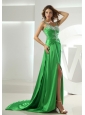 You're sure to leave a lasting impression wherever you go in this fashionable dress. The spring green dress features spaghetti straps encrusted with sparkle beadings and bodice adorned with beadings and ruching. A seductive side slit lets you glide across the dance floor with ease. Soft and sleek taffeta will give your skin intimate care and look beautiful. A watteau train make the dress more beautiful.